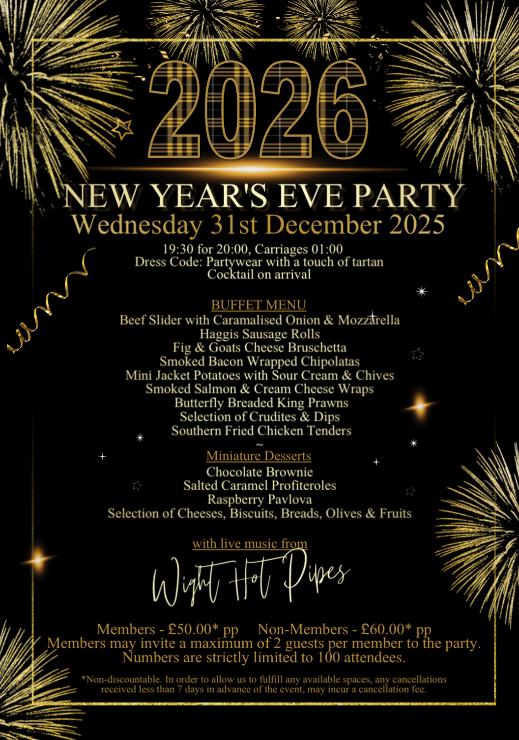 Ring in the New Year in unforgettable style! Join us for a spectacular night of celebration featuring a cocktail on arrival, a delicious 2-course finger food buffet, and live music from the incredible Wight Hot Pipes — complete with their famous flaming bagpipes!