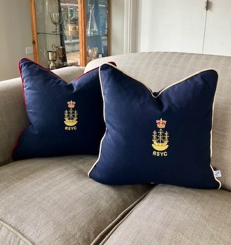 Nautical navy cotton cushions (45x45cm) with red or cream cord piping. Club insignia. Feathers or eco friendly recycle PET inserts (good for boats or outside). Hand made on the Isle of Wight.