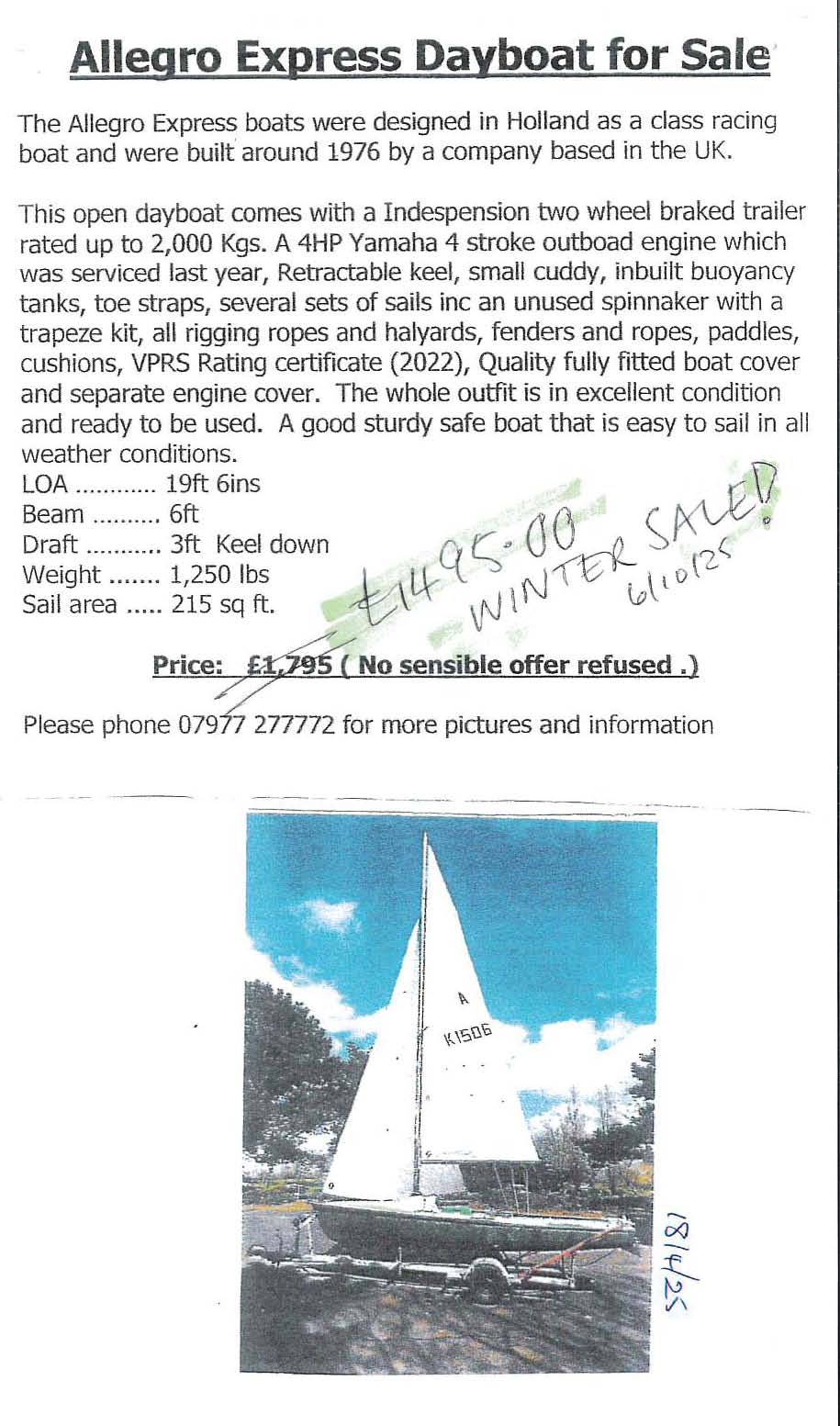 Adverts will be displayed for a 6 month period (please notify us if item is sold in the meantime). This facility is free for RSYC members for the first 6 months.